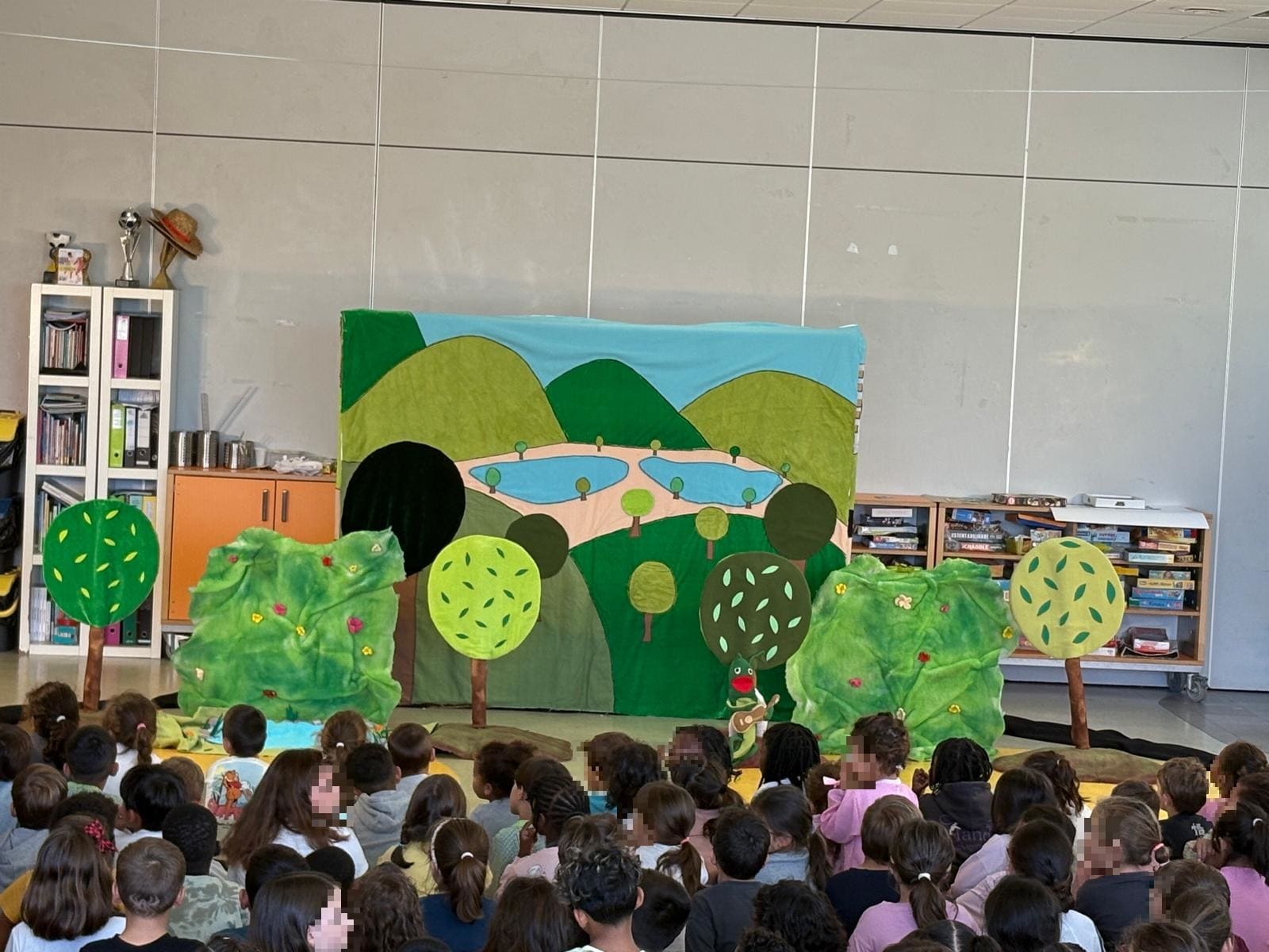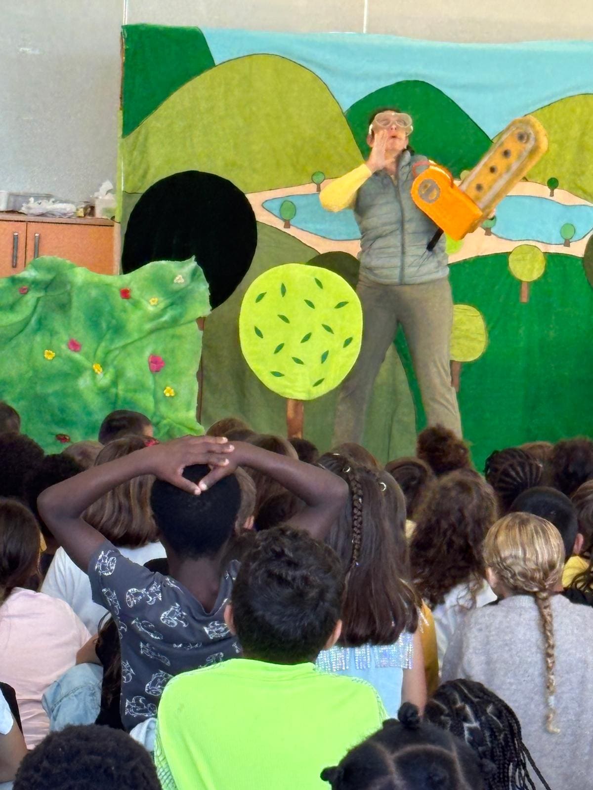 As crianças assistiram à apresentação do livro e das músicas, aprendendo de forma divertida sobre a alimentação saudável e os alimentos da horta.