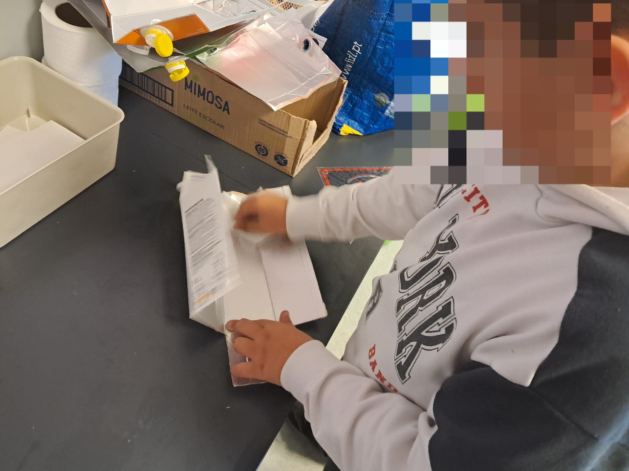 Os restos das embalagens foram colocados nos ecopontos das salas e posteriormente transportados pelas assistentes para os ecopontos exteriores à escola.